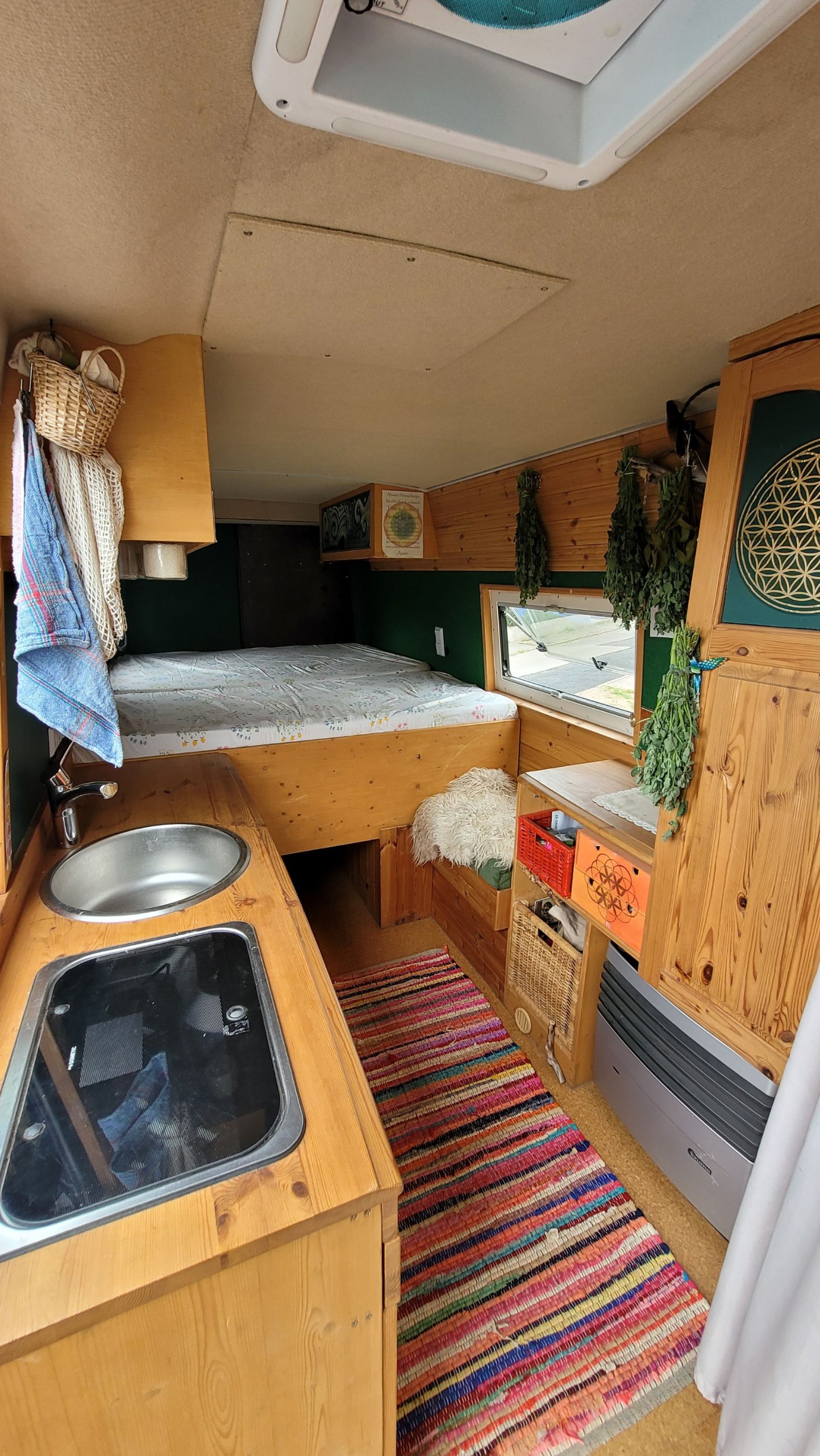 Wie bei so vielen, kam dieser Camper während der Corona-Pandemie in Jaquelines Leben, mit der Intention, einen "anderen Lebensweg" einzuschlagen. Der Camper "Henry le Grand" steht auch für dich auf unserem Parkplatz vorm TinyHaus bereit, um neue Wege / Perspektiven zu erforschen. Liebevoll ausgebaut von Jaquelines Vater mit viel Holz, kannst du hier mit dem Gefühl des "unterwegs-seins" verweilen. (1,70x2m Matratze + Küche, Strom + Heizung, Klo unten im Waldgarten)