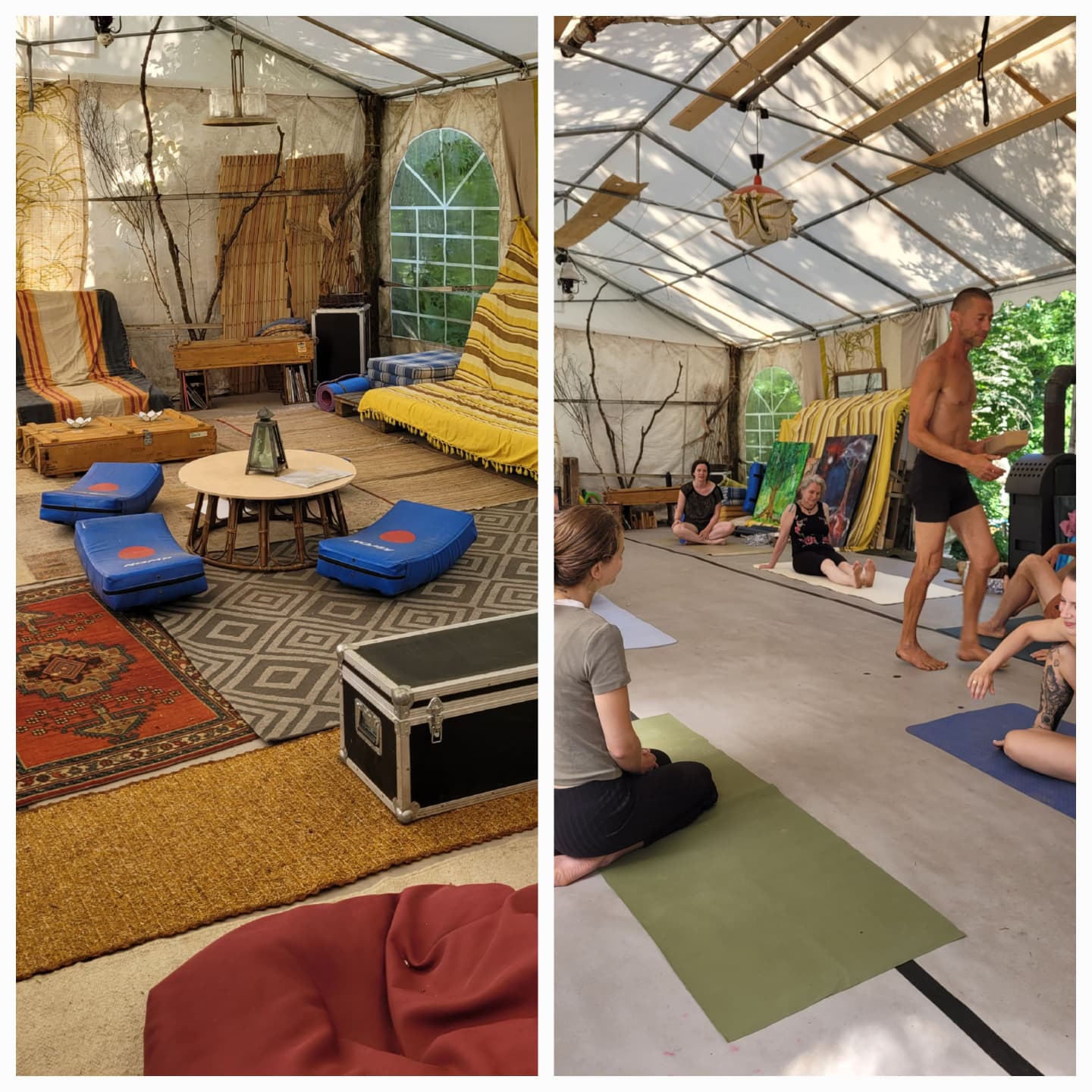 Als Workshop-Zelt mit 12mx6m nutzen wir es im leer geräumten Zustand für unsere Bewegungskunst-Angebote (Körpertherapeutisches Yoga / Movement Training / Contact Impro) , kann aber auch z.B. für unsere Feste zum gemütlich-loungigen Begegnungsraum mit Matratzen, Sitzsäcken, Kissen und Decken umgestaltet werden.