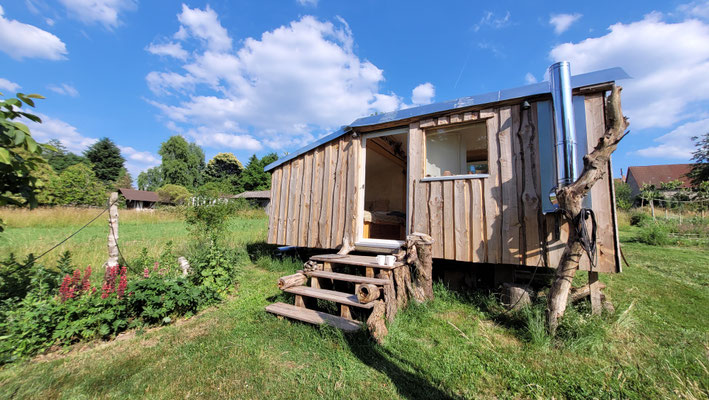 2024 hat Daniel den Schäferwagen aka Bau[m]wagen selbst gebaut - gestaltet aus 100% Naturmaterialien (Holz, Jute-Dämmung, Holzfaser-Dämmplatten, Lehmputz, Naturfarbe) und allerlei Holzkunst.
