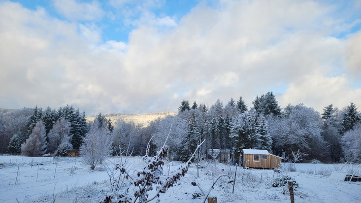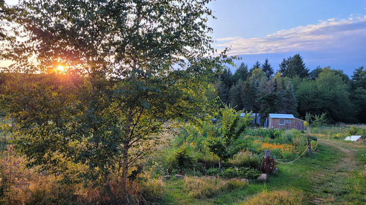 Die "Wilde Waldgarten-Küche" (mit Strom, Wasser, Küchenausstattung) bietet wetterfesten Platz zum Kochen und Entspannen. Eine separate Trockentrenntoilette sowie kalte Außendusche werden gemeinsam mitbenutzt.