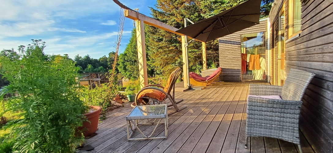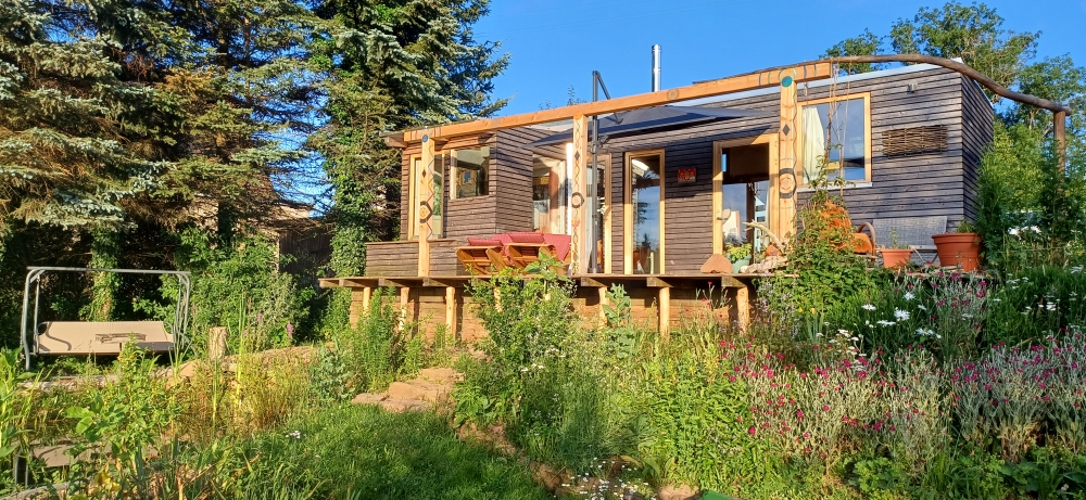 Unterhalb vom Tiny Haus & dem eigenem Natur-Badeteich schließt auf 3.500m² unser artenreicher Waldgarten und Permakultur-Refugium an: mit Bau[m]wagen, Jurte, Wilde Waldgartenküche, 70m² Zelt, Ruheinseln, Riesentrampolin, Slackline, Hängematten usw. Hier können das ganze Jahr ausgiebig frische Luft, Waldklänge, Vogelgesang u.v.m. genossen werden.