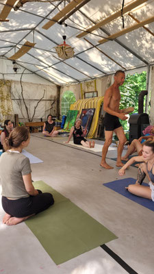 Als Workshop-Zelt mit 72m² nutzen wir es im leer geräumten Zustand für unsere Bewegungskunst-Angebote (Körpertherapeutisches Yoga / Movement Training / Contact Impro) , kann aber auch z.B. für unsere Feste zum gemütlich-loungigen Begegnungsraum mit Matrazen, Sitzsäcken, Kissen und Decken umgestaltet werden.