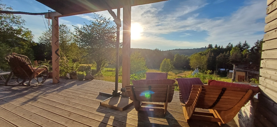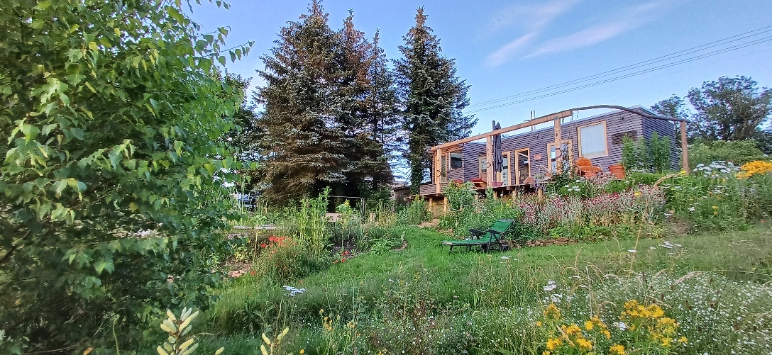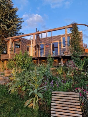 Unterhalb vom Tiny Haus & dem eigenem Natur-Badeteich schließt auf 3.500m² unser artenreicher Waldgarten und Permakultur-Refugium an: mit Bau[m]wagen, Jurte, Wilde Waldgartenküche, 70m² Zelt, Ruheinseln, Riesentrampolin, Slackline, Hängematten usw. Hier können das ganze Jahr ausgiebig frische Luft, Waldklänge, Vogelgesang u.v.m. genossen werden.
