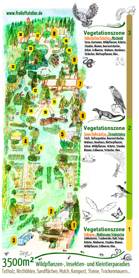 Als Ort für natürliche Entwicklung befindet sich das Freiluft Atelier in einem kontinuierlichen, kreativen & schöpferischen Gestaltungsprozess. Stück für Stück und Jahr für Jahr wächst hier ein essbarer Waldgarten, der zur Erhaltung und Förderung der Artenvielfalt beiträgt und den Menschen seine Verbindung zur Natur spüren lässt.